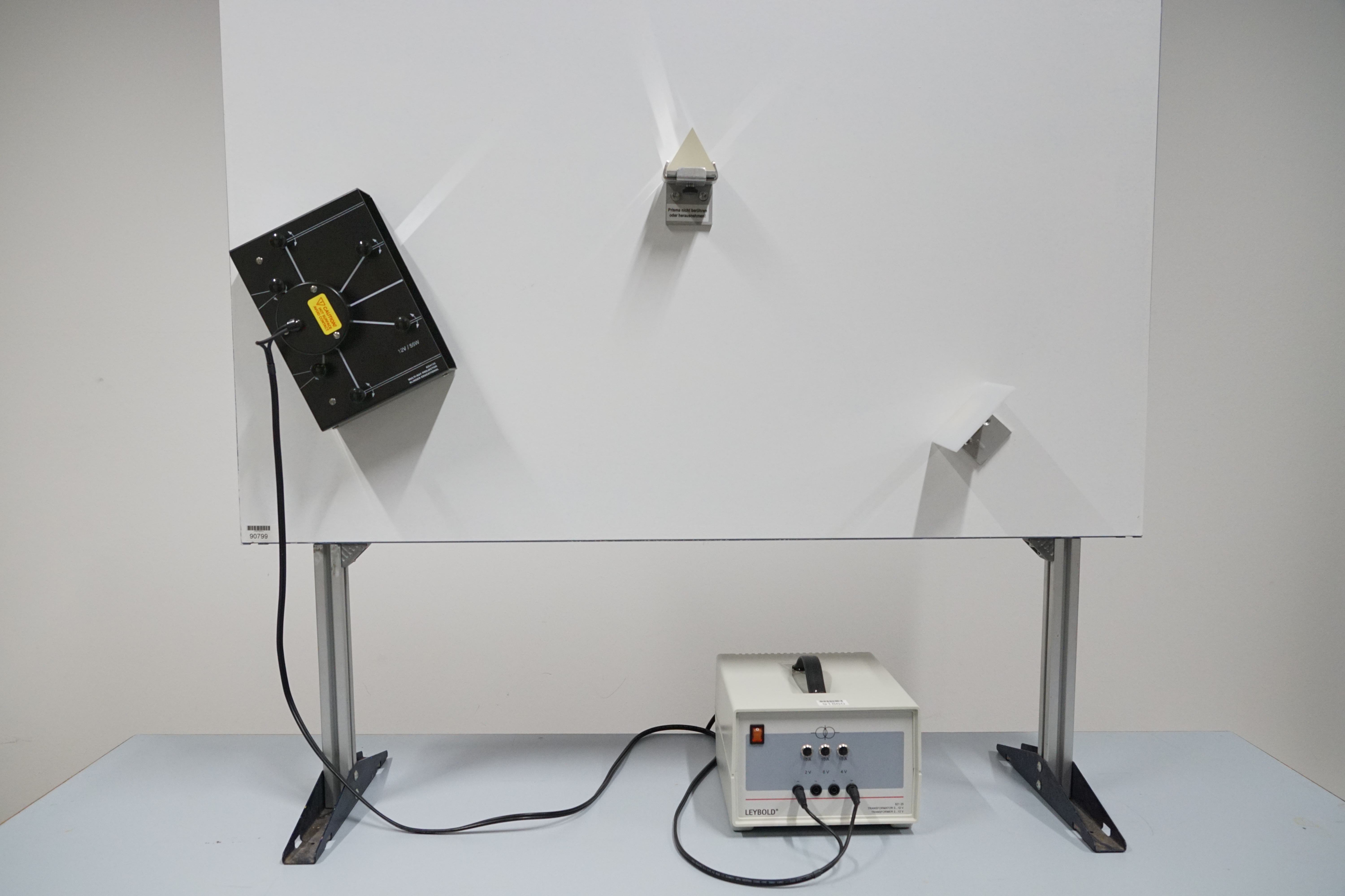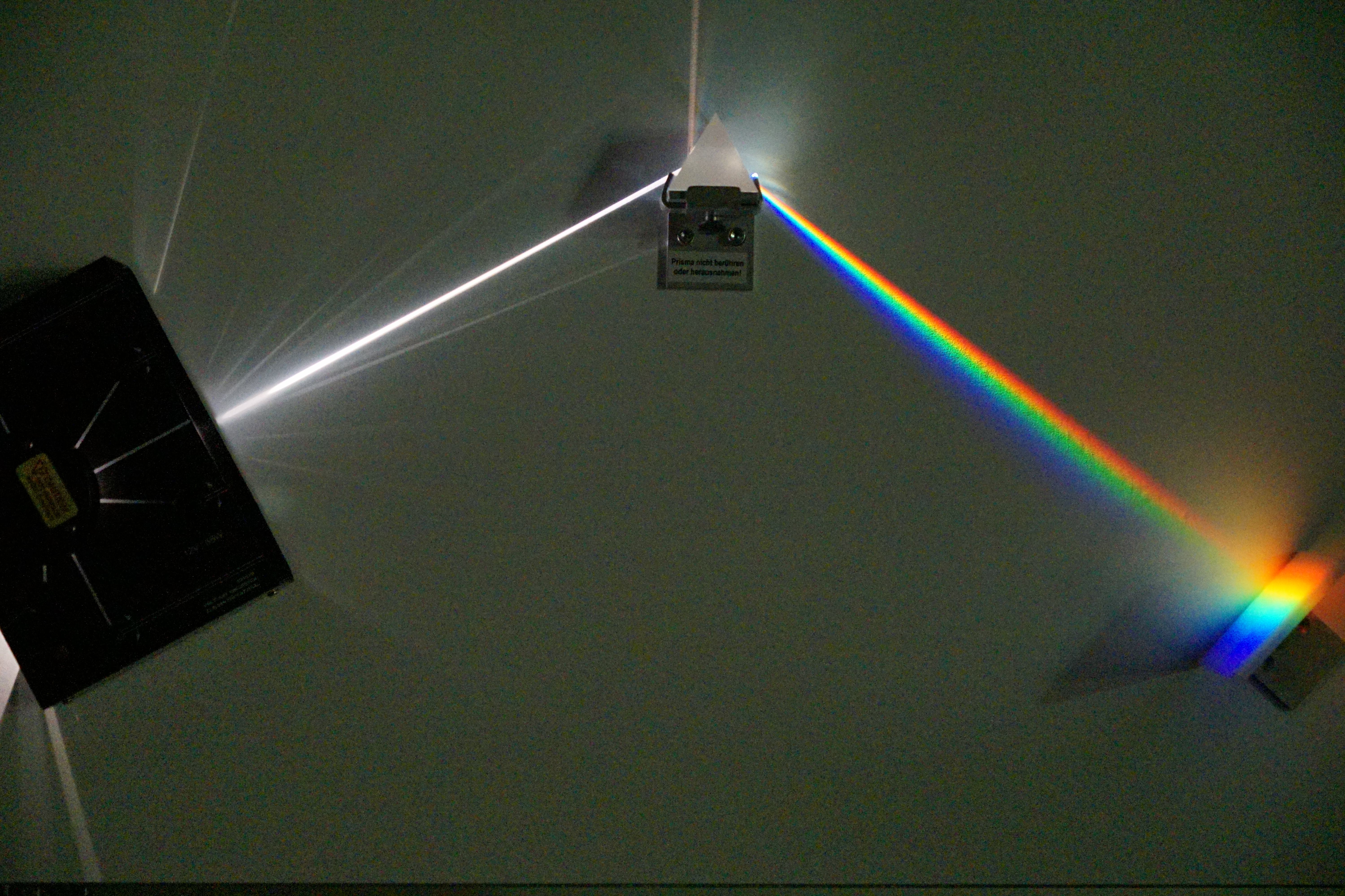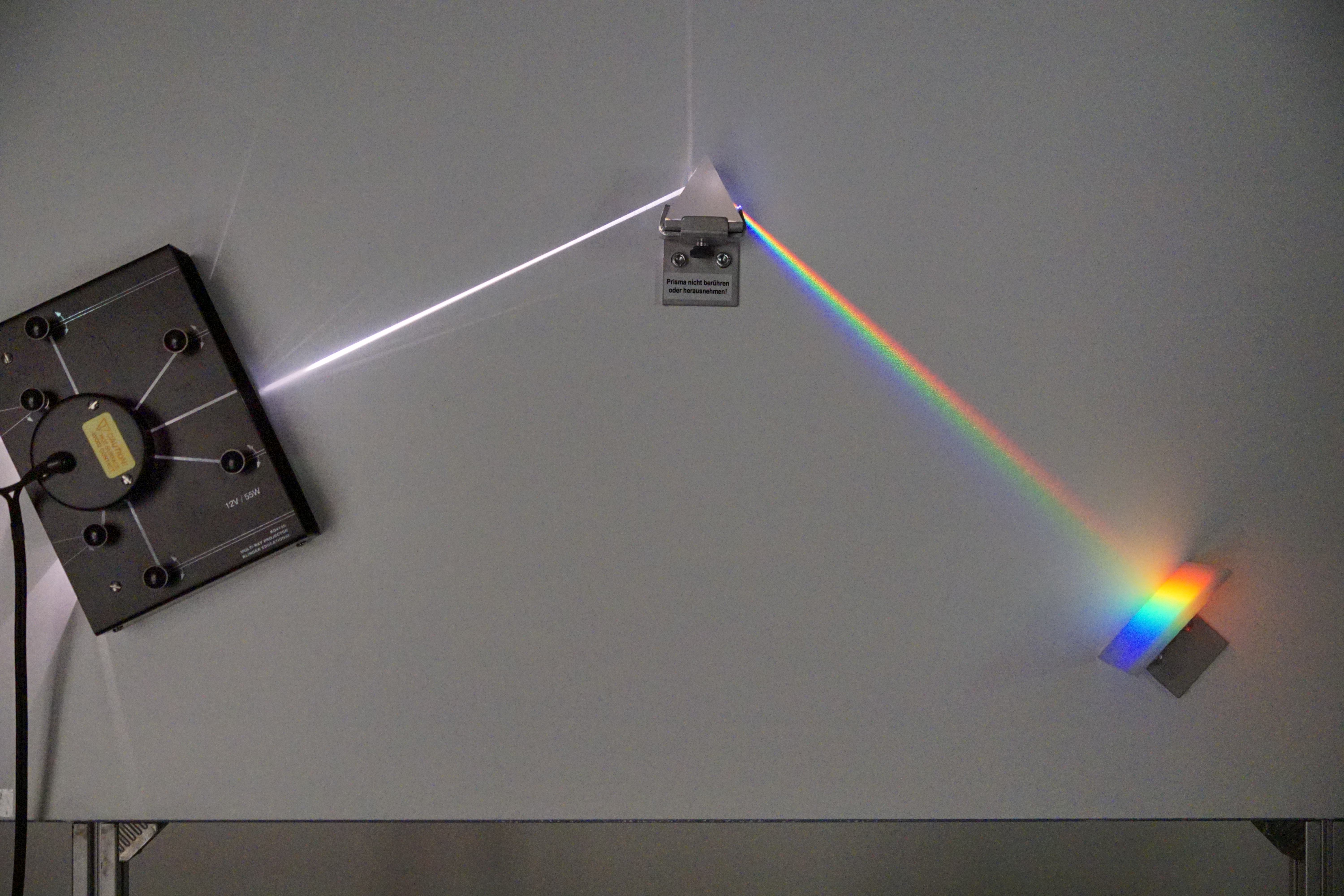 In diesem Versuch wird die Dispersion am Prisma gezeigt. Das weiße Licht der Halogenlampe spaltet in ein Spektrum auf.